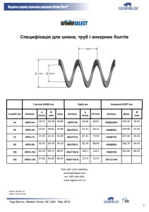 Hog Slat Inc. Newton Grove, NC USA May 2015 1 Подача корму гнучким шнеком Grow Flex TM Специфікація для шнека, труб і анкерних болтів Гнучкий ШНЕК мм Труба мм Анкерний БОЛТ мм ø труби мм Артикул ø внутр Ø зовн Крок Артикул ø внутр Ø зовн Артикул Довж. Ø зовн 44 HSFA-44 20.57 36.58 50.80 HSPFT45 44.96 48.01 HSAB45UP 276.35 19.05 55 HSFA-55 22.61 38.61 32.00 HSAT55-S 51.31 56.13 HSAB55C 254.00 22.35 75 HSFA-75 37.34 61.21 41.40 HSAT75-S 67.31 74.93 HSAB75C 317.50 35.05 90 HSFA-90 45.47 69.34 54.10 HSAT90-S 81.79 88.90 HSAB90U 266.70 44.45 108 HSFA-108 62.23 90.17 68.07 HSAT108-S 103.1 114.3 HSAB108 101.60 60.45 125 HSFA-125 67.06 95.00 66.04 HSAT125-S 117.9 127.0 GFLX-2192 ТОВ «ХОГ СЛАТ УКРАЇНА» ukraine@hogslat.com тел. (067) 446-0101 www.hogslat.com.ua HSART-398 REV IR Market: Hog & Poultry